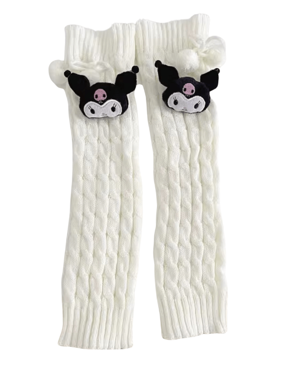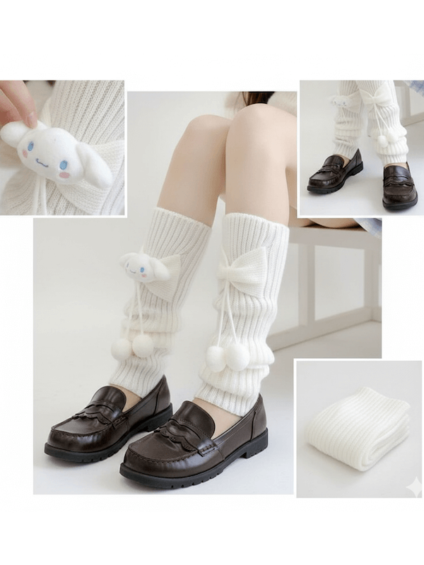 Wrap your legs in adorable charm with these Cinnamoroll plush knotbow leg warmers! Crafted from soft knit cotton, they come in classic white and black to match any outfit. Choose your favorite Sanrio character—Cinnamoroll, Melody, Hello Kitty, or Kuromi—each featuring a cute bow and pompon design. Whether you're going for twisted pompon style or classic knotbow vibes, these cozy leg warmers bring playful personality to your wardrobe.